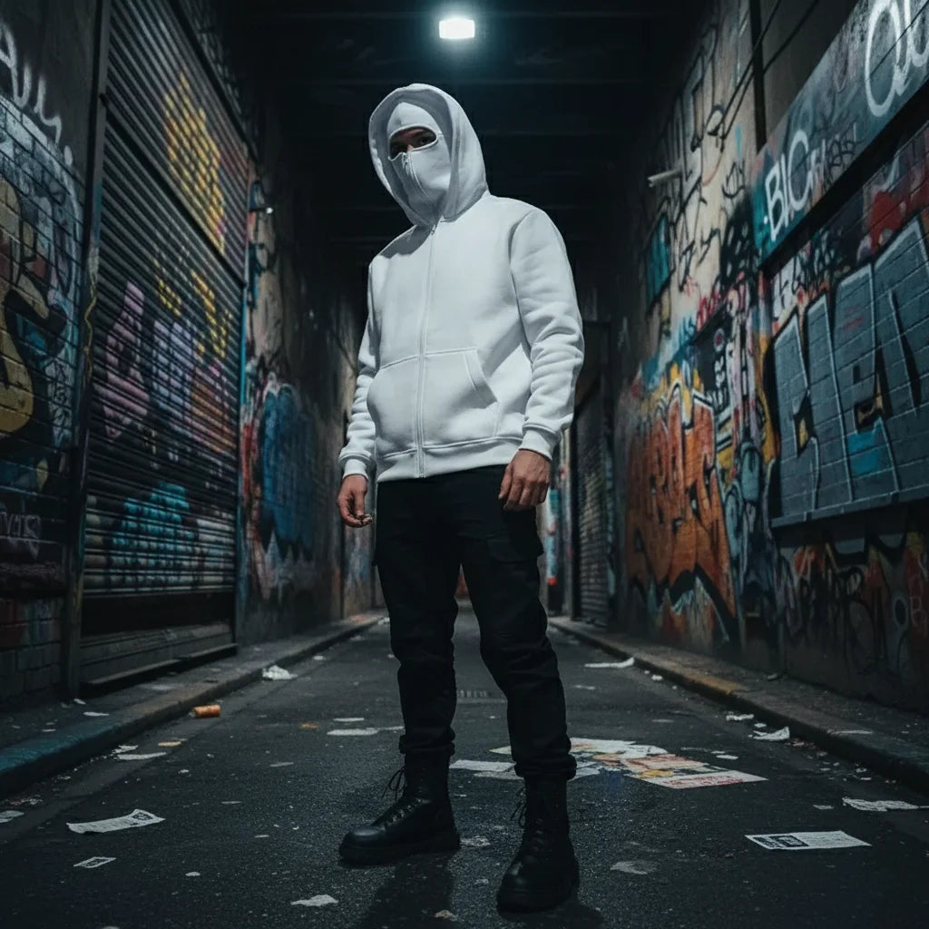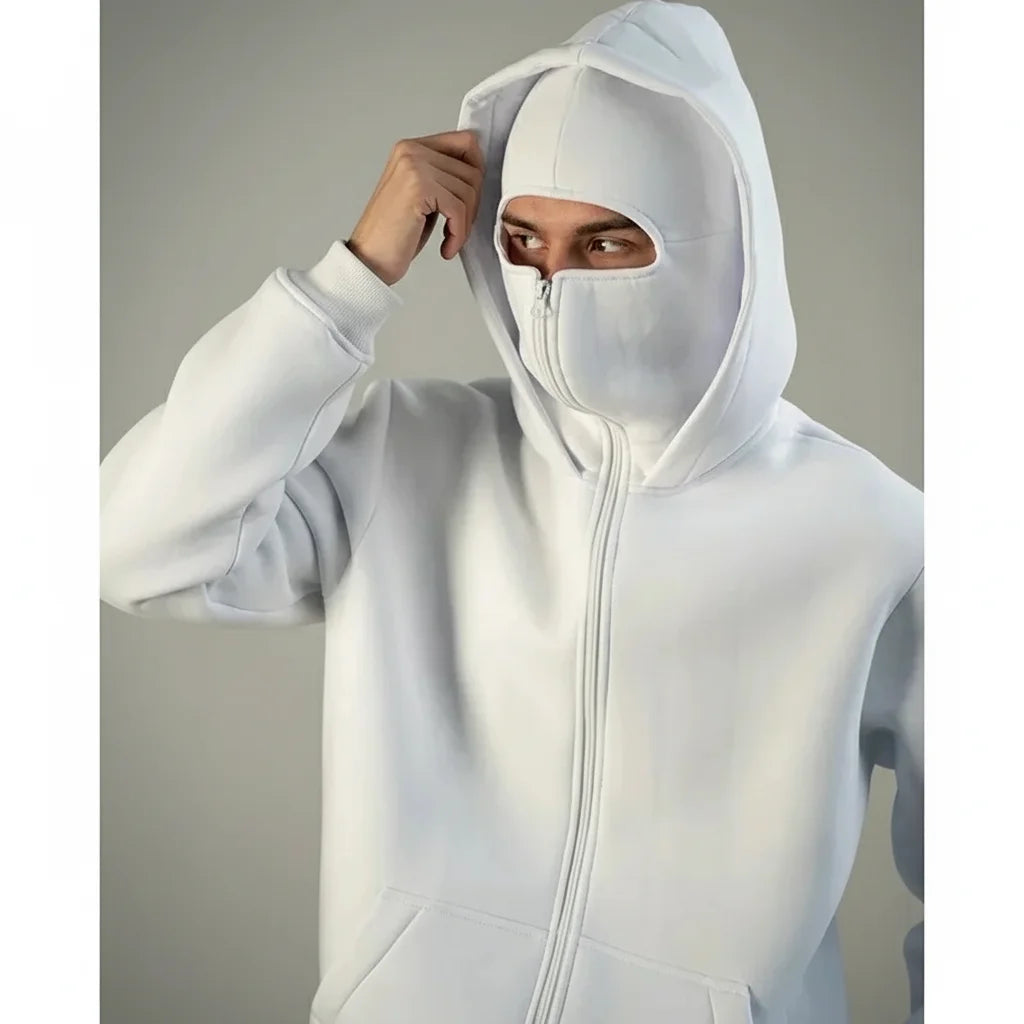 The built-in mask has a convenient zipper for easy adjustment. Wear it fully zipped for maximum coverage and an edgy look, or partially open for a more relaxed vibe. It's designed for seamless integration into your outfit.